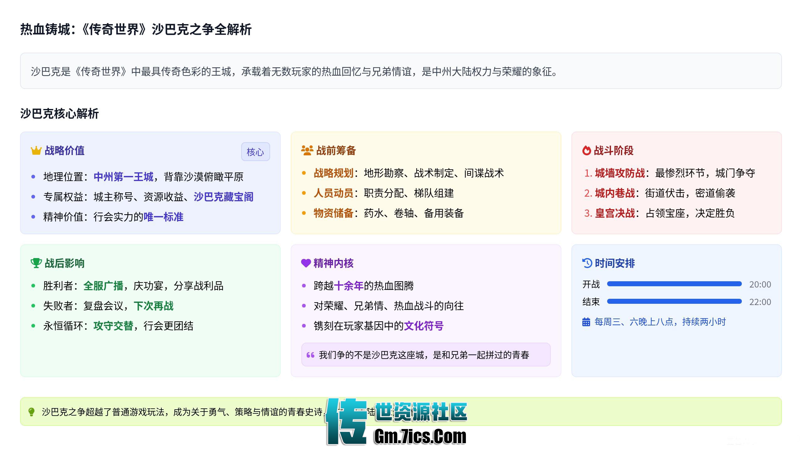 热血铸城:《传奇世界》沙巴克之争全解析在《传奇世界》的中州大陆上,没有哪一场战役能像沙巴克之争那样,跨越十余年依然是玩家心中的热血图腾。这座矗立在玛法边缘的王城,不仅是游戏中权力与荣耀的顶点,更承载了无数玩家的兄弟情谊与青春记忆。从行会集结的号角到城墙攻防的厮杀,从策略布局的博弈到胜利时刻的狂欢,沙巴克之争早已超越了普通游戏玩法的范畴,成为一种镌刻在玩家基因中的文化符号。 一、沙巴克:为何成为必争之地?沙巴克的核心魅力,源于其“中州第一王城”的绝对地位。在游戏设定中,这座城池坐落于战略要冲,背靠沙漠而俯瞰平原,进可号令群雄征战四方,退可凭借高大城墙坚守待援。而除了地理优势,系统赋予的专属权益更是让所有行会趋之若鹜——占领沙巴克的行会将获得“沙巴克城主”的至高头衔,全体成员可使用专属称号彰显身份;城池内的商铺、铁匠铺等设施能为行会带来稳定的资源收益,让行会发展步入快车道;更重要的是,沙巴克城主可开启专属副本“沙巴克藏宝阁”,获取全服稀缺的装备与道具,形成实力碾压的良性循环。 但比物质奖励更珍贵的,是沙巴克承载的精神价值。在《传奇世界》的社交生态中,能否拿下沙巴克是衡量一个行会实力的唯一标准。为城主而战、为兄弟而拼的口号,让原本陌生的玩家凝聚成生死与共的团队,这种“一荣俱荣,一损俱损”的归属感,正是沙巴克之争最动人的底色。 二、战前筹备:一场没有硝烟的博弈沙巴克之争的胜负,往往在开战前就已埋下伏笔。一场合格的战前筹备,需要兼顾战略规划、人员动员与物资储备三大核心,少则一周,多则数月。 战略布局是筹备的核心。行会管理层会提前一周勘察沙巴克地形,标注城墙薄弱点、复活点、密道入口等关键位置,并根据对手行会的作战风格制定战术——若对手擅长正面强攻,便安排“法师+道士”组合在城墙布下火墙与毒阵;若对手习惯偷袭密道,就派高血量战士组成“守关队”死守咽喉要道。同时,行会会通过“间谍战术”打探对手的人员数量、核心战力分布,甚至故意放出虚假作战计划迷惑对方。 人员动员则考验行会的凝聚力。管理层会通过行会频道、QQ群、语音频道反复强调战役重要性,明确各成员的职责:战士负责正面突破与守旗,法师承担范围输出与清场,道士则专注于治疗、施毒与召唤神兽辅助。对于核心战力,会提前分配“定制任务”,比如让高等级战士紧盯对方城主,让极品法师守住复活点;对于普通成员,则会组建“梯队”,确保战斗中有人受伤退场时能及时补位。 物资储备是战斗的“后勤保障”。行会会集中收集金币、药水、卷轴等物资,为成员统一发放——战士配备大量超级金疮药与太阳水,法师准备充足的魔法药,道士则囤积解毒药与护身符。更有实力雄厚的行会会提前打造一批“备用装备”,供成员在装备损坏时紧急更换,避免因装备问题退出战斗。 三、战时厮杀:从城墙到皇宫的生死较量沙巴克之争的正式开战时间为每周三、六晚上八点,持续两小时,但真正的厮杀往往在开战前半小时就已打响。当系统提示“沙巴克攻城战即将开始”时,攻守双方会率先在沙巴克城外的“猪洞入口”“沙漠土城”等集结点爆发遭遇战,目的是消耗对方的药水与战力,为正式攻城扫清障碍。 晚上八点整,攻城战正式开启,战斗会迅速分为三个阶段推进。第一阶段是“城墙攻防战”,这是整场战役最惨烈的环节。攻城方会集中所有法师在城墙下释放“冰咆哮”“流星火雨”,用范围技能压制城墙上的守方;同时,高等级战士会借助“野蛮冲撞”突破守方的前排防线,试图爬上城墙打开城门。守方则会在城墙垛口后密集输出,道士释放“群体施毒”,法师用“火墙”封锁城墙台阶,战士则用“烈火剑法”斩杀试图登城的敌人。城门口往往是争夺焦点,攻防双方会在这里反复拉锯,尸体堆积如山,药水与技能特效交织成一片混乱的光影。 第二阶段是“城内巷战”。当攻城方突破城墙或炸开城门后,战斗会进入城内街道。此时攻方会兵分两路:一路主力直奔皇宫,试图占领核心区域;另一路则负责清剿城内的守方残余势力,防止后方被偷袭。守方则会利用街道狭窄的地形设置“伏击点”,在拐角处安排法师释放“火墙”,道士在暗处施毒,战士突然冲出收割残血敌人。密道成为关键战场,攻方会派小股精锐通过密道直插皇宫后院,守方则会派专人死守密道出口,一场“短兵相接”的恶战在所难免。 第三阶段是“皇宫决战”。这是决定胜负的最后环节,规则是“占领皇宫且在战役结束时保持控制权”。攻方会集中所有核心战力强攻皇宫大门,法师用“雷电术”破坏大门血量,战士合力击杀守门的守方精锐;一旦大门攻破,便迅速冲入皇宫内抢占“城主宝座”。守方则会在皇宫内形成“环形防御圈”,以宝座为中心层层设防,道士持续为队友加血,战士死守宝座周围,法师则用范围技能清理冲进来的敌人。此时,双方的行会会长会亲自下场指挥,通过语音频道喊出“集火那个法师”“守住宝座”等指令,整个皇宫内技能漫天飞舞,血量提示不断闪烁,每一秒都充满变数。 四、战后余韵:荣耀与遗憾的双重回响当系统提示“沙巴克攻城战结束”的瞬间,沙巴克城会陷入短暂的寂静,随后便是胜利者的狂欢与失败者的沉默。占领沙巴克的行会成员会自动获得